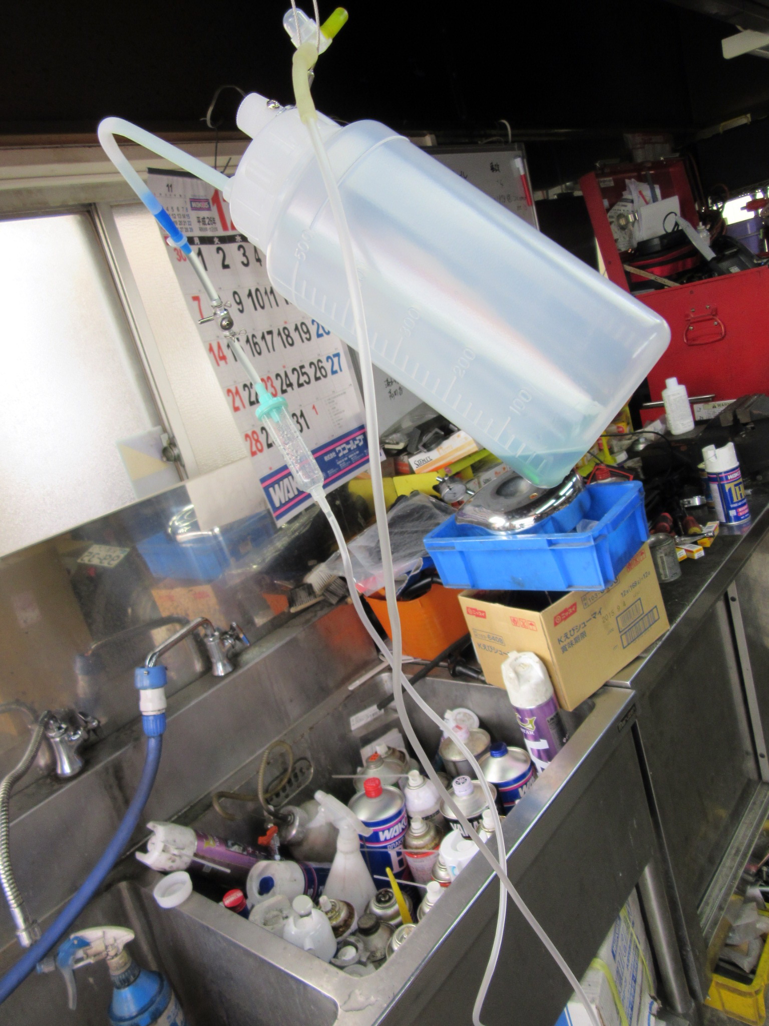 点滴のように薬剤を入れて、非分解で内部の汚れを洗浄するのです!